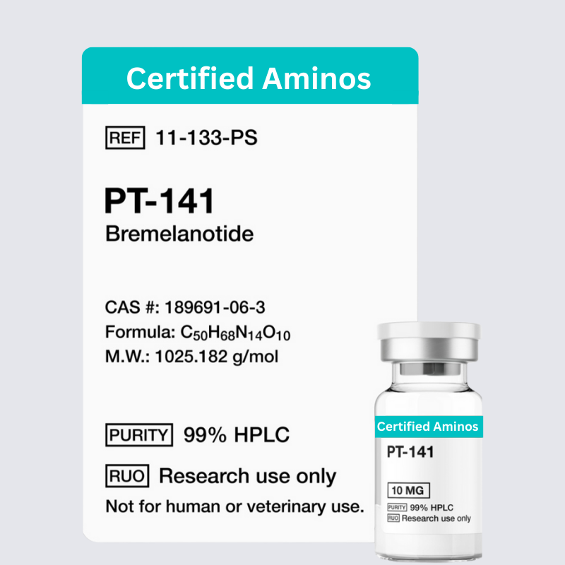PT-141 is a modified form of the peptide melanotan II, derived from alpha-melanocyte-stimulating hormone (α-MSH). It primarily activates melanocortin receptors MC-4R and MC-1R, which play key roles in sexual behavior, immune function, and vascular response.